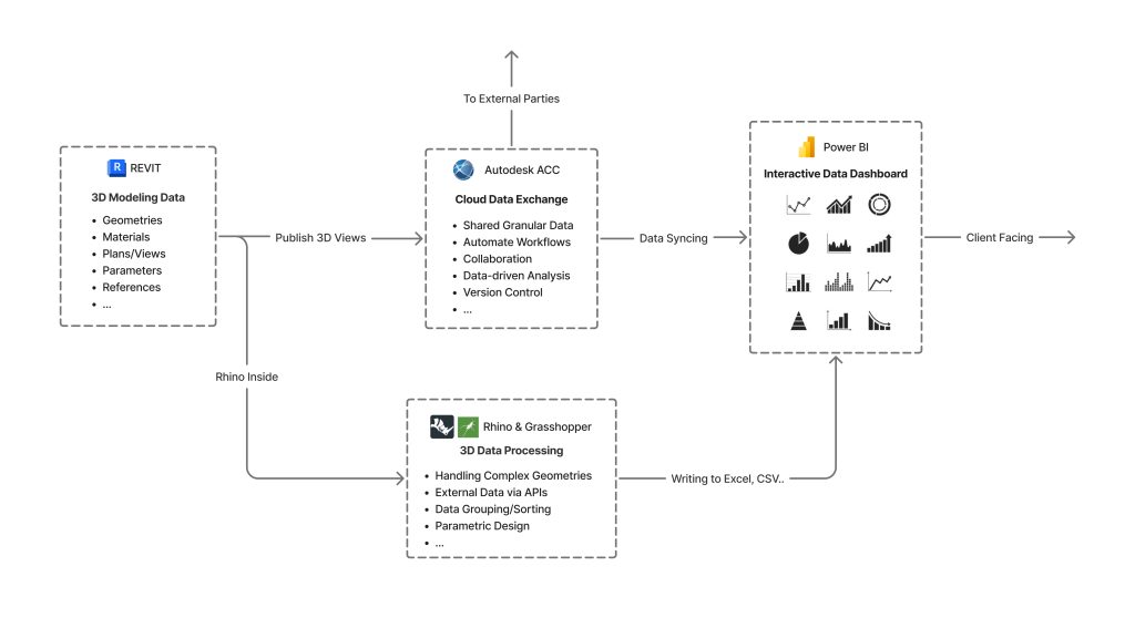 Because the entire chain stays connected — Grasshopper to Revit, Revit to ACC, ACC to Power BI — the dashboard becomes a live communication tool. Clients do not need to open Revit or understand technical schedules. The interface is intuitive, interactive, and always tied back to the model as the single source of truth. As designs evolve and new data is imported or recalculated, the dashboard updates automatically, turning BIM from static documentation into an intelligent, real-time information system.