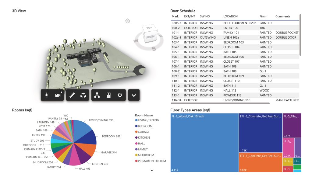 Power BI connects directly to ACC and reads the published data. As new models are uploaded, the dashboard automatically synchronizes, including any Grasshopper-generated metrics. Instead of static schedules, BIM data becomes filters, charts, and comparison visuals — room size breakdowns, door counts by rating, program vs. design area, or energy overlays from imported datasets. Clients and team members can explore building zones, apply filters, and visually track changes over time.