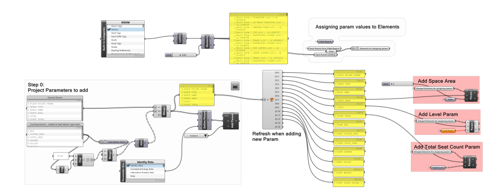 The workflow begins with Revit as the core data source. Room areas, door schedules, equipment lists, and material takeoffs all exist natively in the model and remain accurate as design evolves. Through Rhino.Inside.Revit, Grasshopper can import external datasets — such as programming spreadsheets, GIS layers, energy analysis outputs— and map them to Revit parameters. It can compute derived metrics (like program compliance or area deltas), assign room properties based on external tables, or even drive parametric adjustments to model geometry, keeping design and data synchronized.